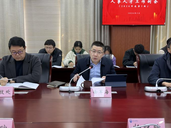 3月10日下午,我校2026年第一期人事人才工作例会在行政楼327会议室召开。会议系统部署2026年人事人才十大重点任务,统一思想、凝聚共识、明晰路径,为全年人事人才工作高质量推进谋篇布局、奠定基础。副校长徐军海出席会议并讲话。教务处、科学技术处(社会科学处)、学科建设与研究生管理处、教师发展与教学评估中心、各二级学院负责人,人力资源处全体工作人员及各二级学院人事秘书参加会议。会议由徐军海主持。